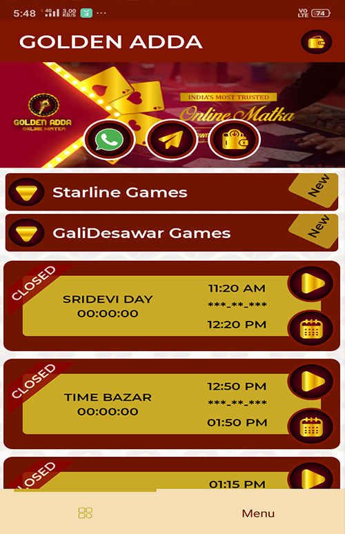 Let your guessing win you massive amount through Golden Adda Online Matka App. Join our platform for expert advice and Golden Adda Online Matka tips. Get the most trusted results daily. Play Online Market King through Golden Adda Online Matka is the most preferred and platform for online Golden Adda Online Matka play. It provides the most updated Satta Golden Adda Online Matka play results. Our app is one stop for all the updated live results for various Golden Adda Online Matka market. Use Golden Adda Online Matka to get the live updated results and earn huge profit. Earn Real Money through your tricks and updates.